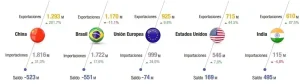 A corrente de comércio, portanto, foi de US$ 3,10 bilhões com a China e de US$ 2,892 bilhões com o Brasil.